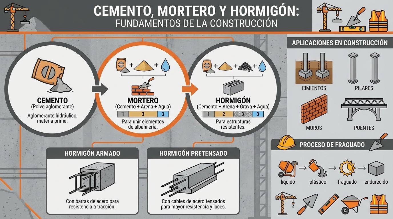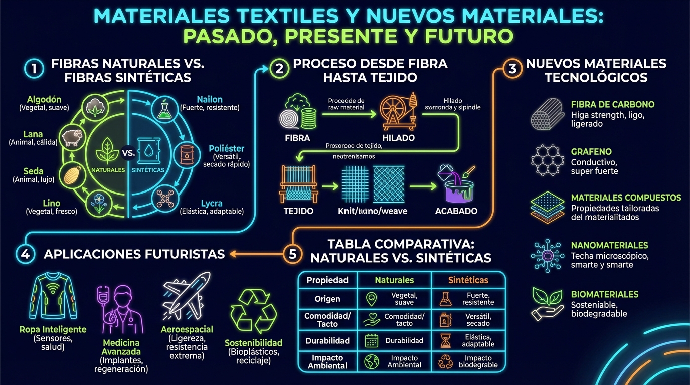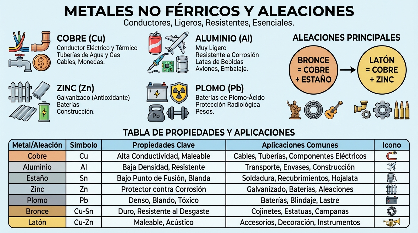 Infografías sobre metales férricos y no férricos, aleaciones, plásticos, reciclaje, cemento, cerámica, vidrio y materiales aislantes.