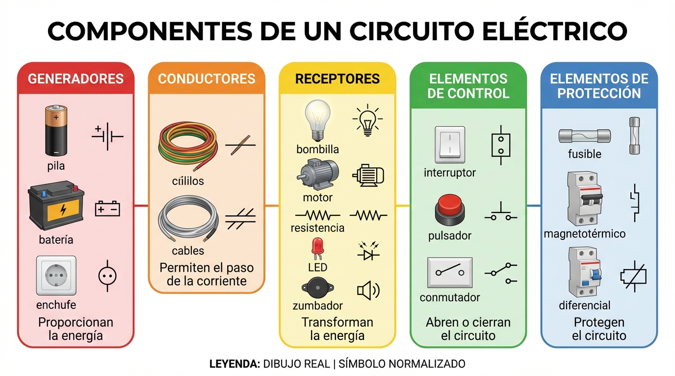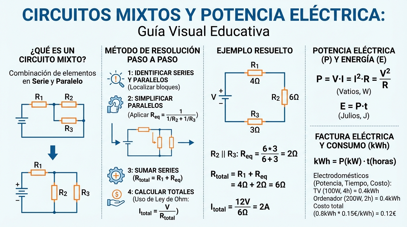 Tema 6: Circuitos Eléctricos 📚 Tema 6: Circuitos Eléctricos Infografías sobre electricidad, magnitudes eléctricas, componentes, circuitos serie y paralelo, Ley de Ohm, circuitos mixtos y simuladores. ← Volver a Docencia