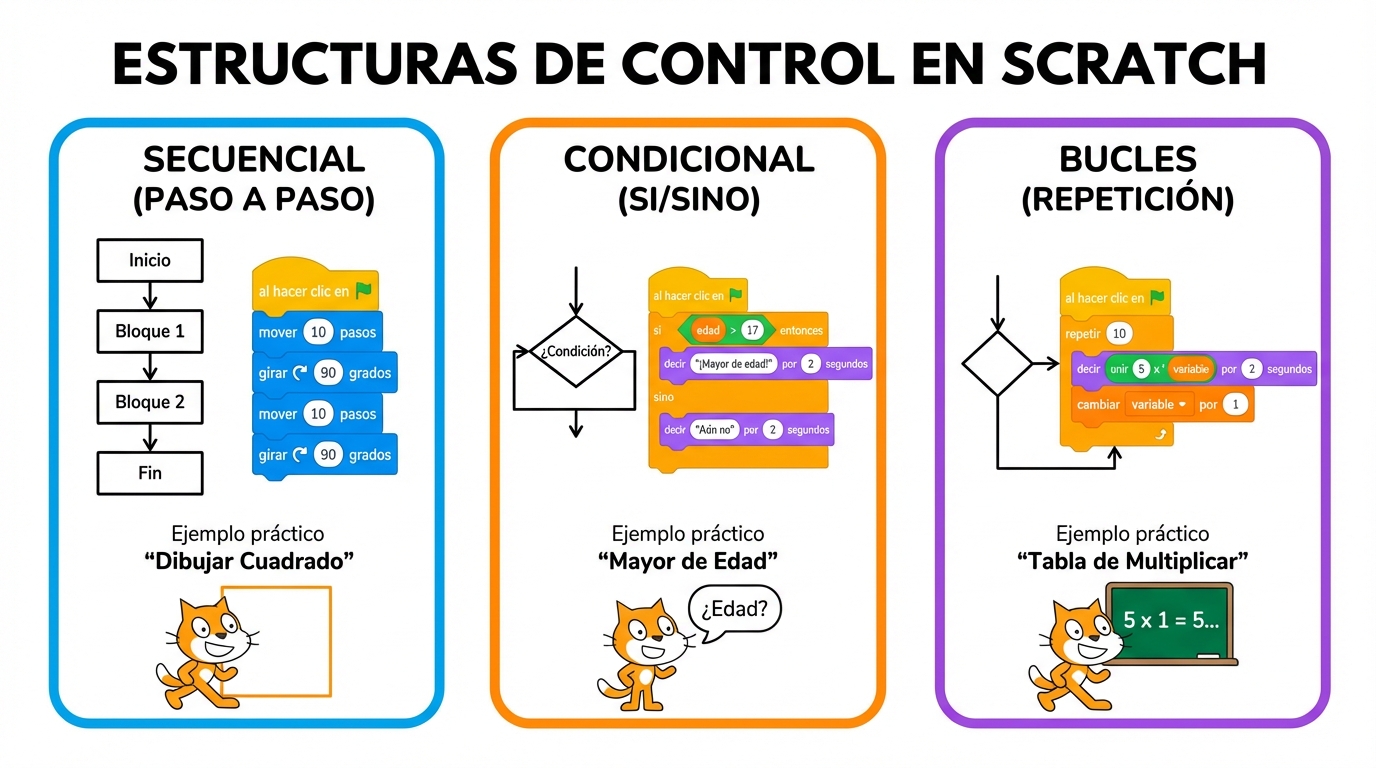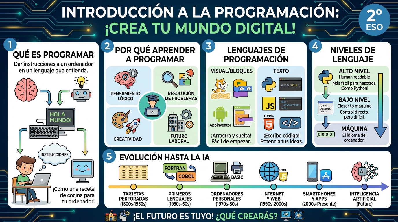 Tema 9: Informática y Programación 📚 Tema 9: Informática y Programación Infografías sobre algoritmos, diagramas de flujo, Scratch, estructuras de control, variables, eventos, creación de videojuegos y otros lenguajes. ← Volver a Docencia